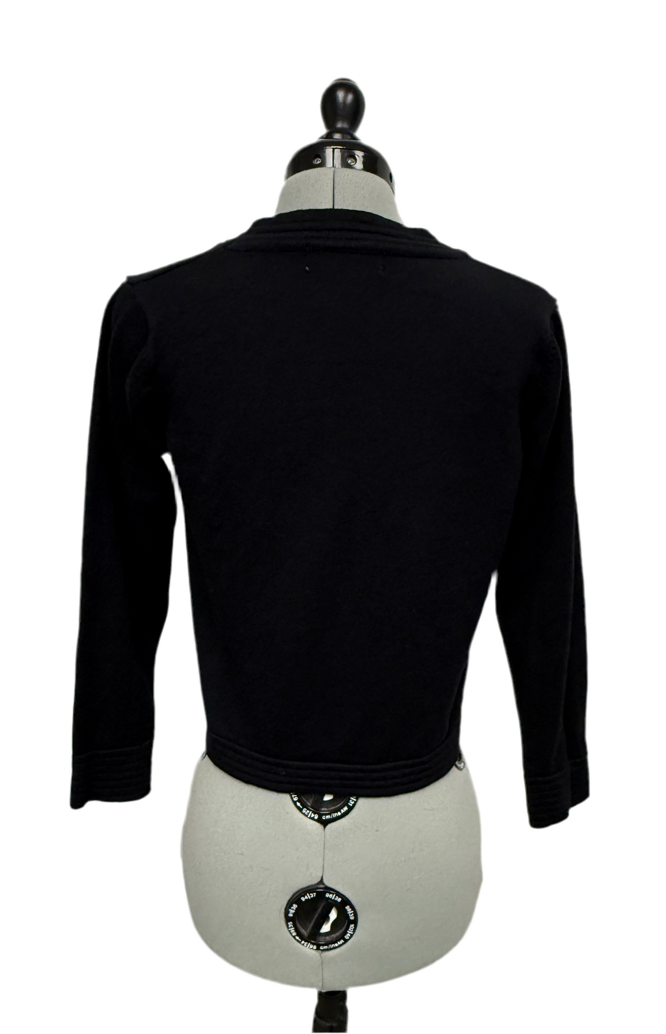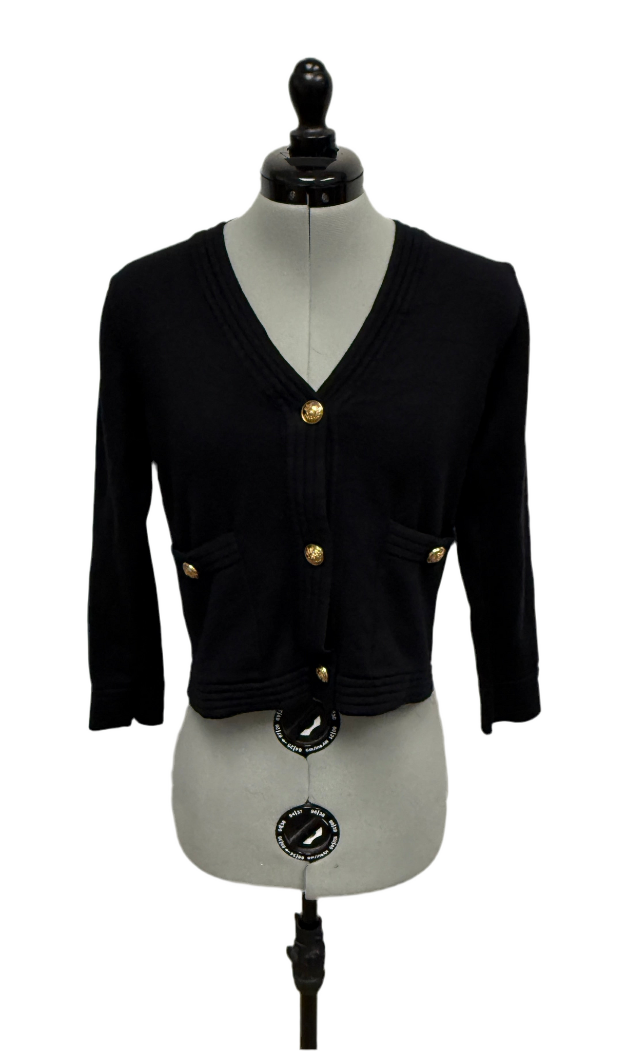Details: Black sweater with gold, detailed buttons. Made in Korea