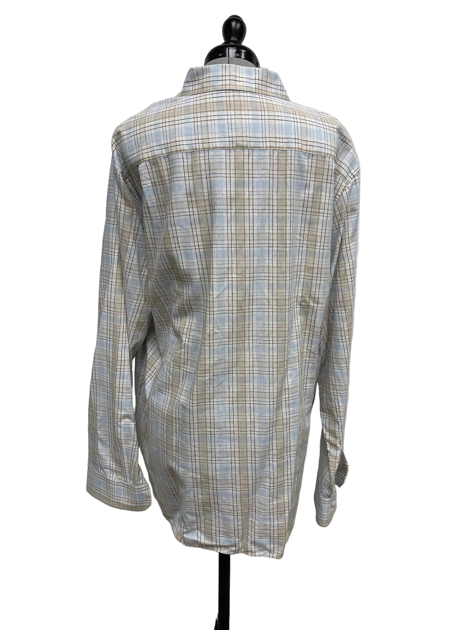Details: White with blue and brown collared dress shit with 1 breast pocket