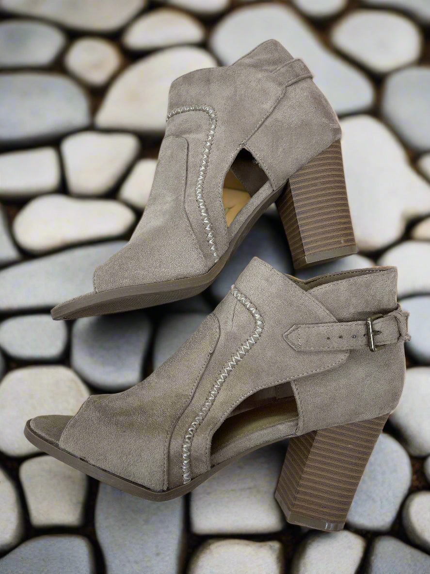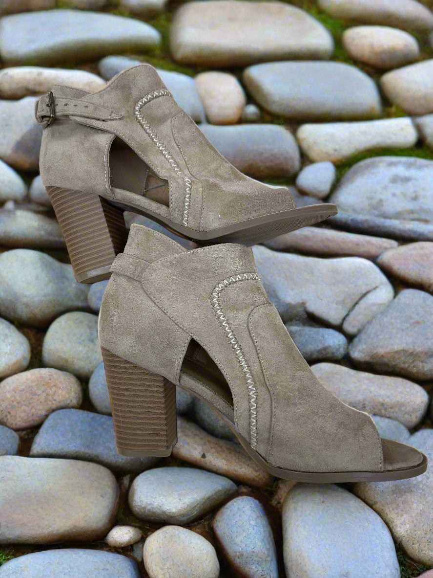 Details: Tan open toe high heel shoes