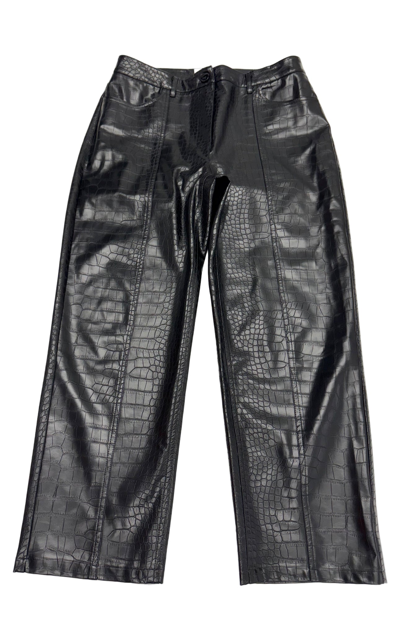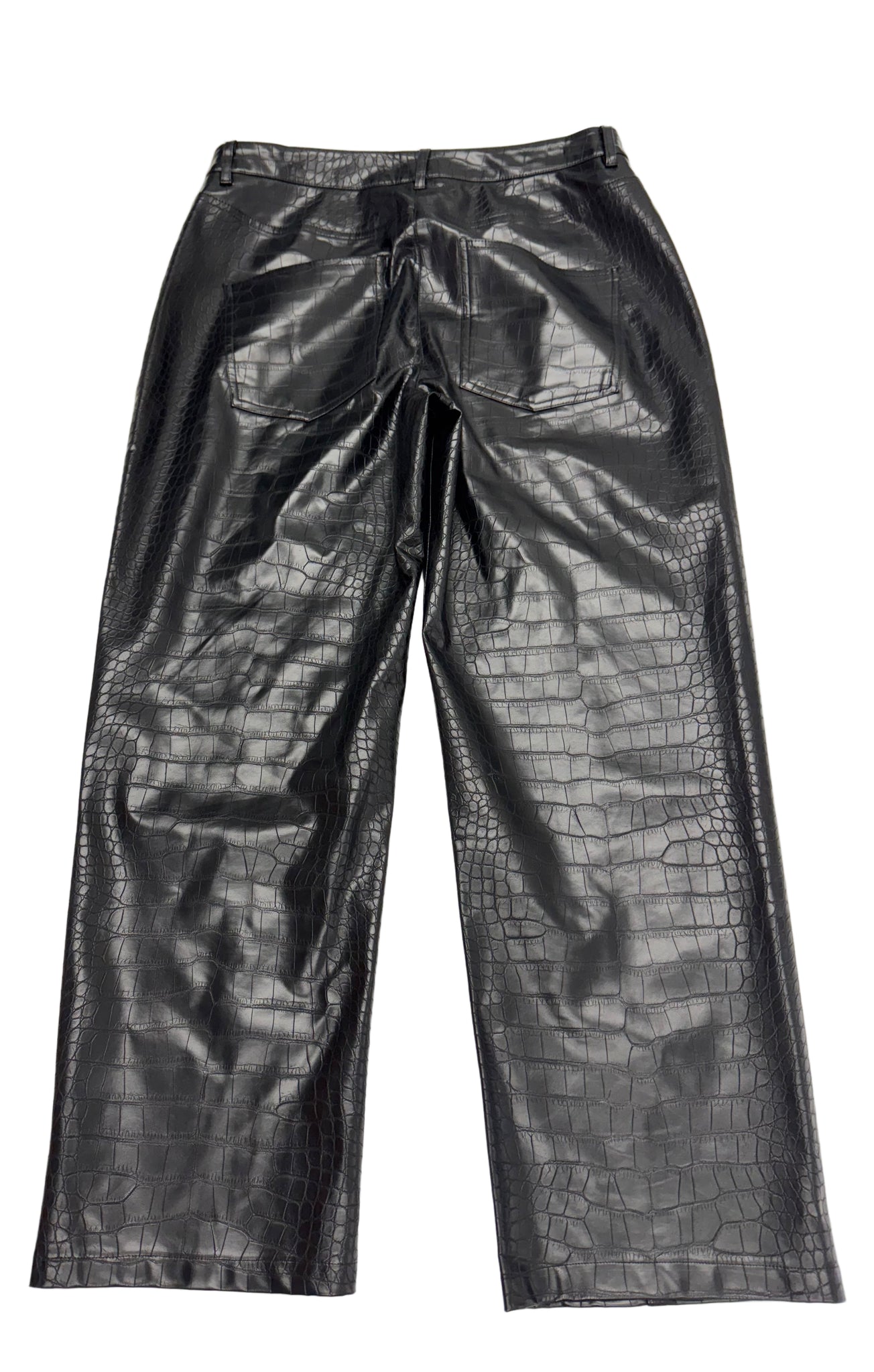 Details: Black faux leather pants with pockets